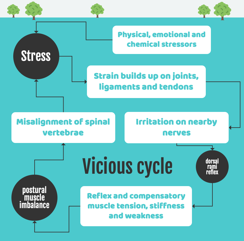 In this way, Chiropractic adjustments help to break the vicious cycle in which stress and strain causes spinal fixations to develop over time. Once external stress is introduced into the system, this can become a self-perpetuating cycle unless the body has the chance to repair itself: