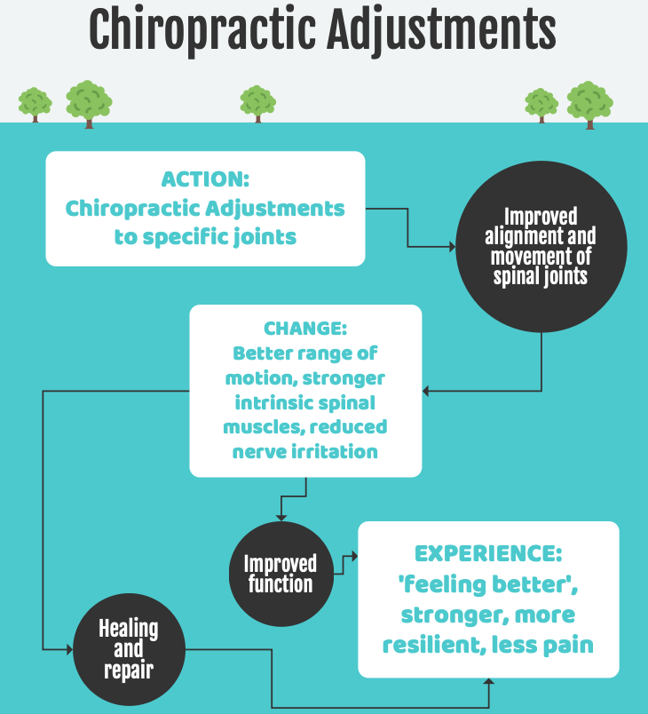 The flow-chart shows how it works. The Spinal Adjustments are simply helping to restore proper and full function to the body, allowing the body to do what it should have been doing the whole time. Ultimately, this promotes health, which gives rise to ‘feeling better’. Notice how ‘less pain’ is just one component of the improvements you can enjoy from this process. Sometimes these results arrive quickly, but other times they may take longer, especially if the dysfunction has developed over a long period of time.